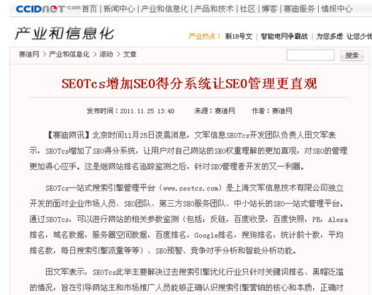 騰訊報道:SEOTcs增加SEO得分系統讓SEO管理更直觀